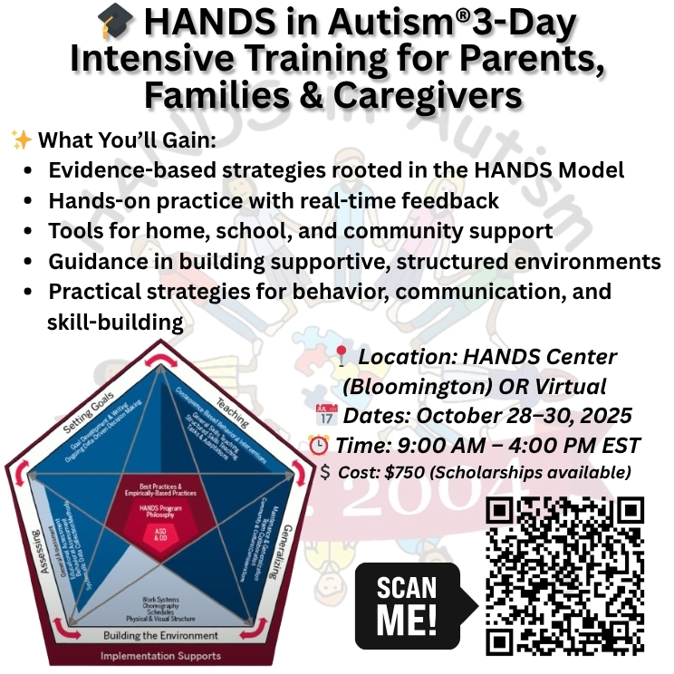 Join us this fall for HANDS in Autism®’s 3-Day Intensive Training, designed to empower families and caregivers with practical, evidence-based strategies rooted in the HANDS Model. Through interactive lectures, discussions, and hands-on activities, participants will build the knowledge and confidence to create supportive environments at home and in the community.