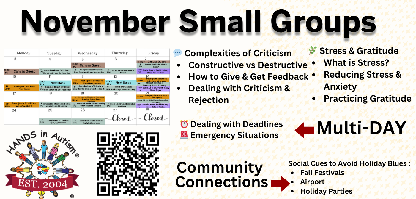 This month, our Small Groups, Multi-Day Sessions, and Community Connections are packed with real-life topics to help you grow, de-stress, and have a little fun along the way. Let’s wrap up the year stronger (and maybe even a little wiser).
